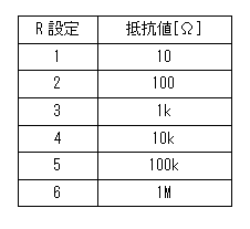 以下の測定手順において、抵抗値Rの値はレンジの設定(1〜6)により以下の値を使用します。