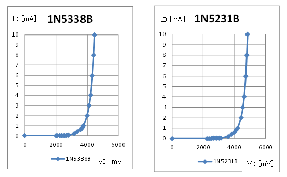 小さい電圧で使用すると、ツェナー電圧は仕様より小さくなることが判りました。