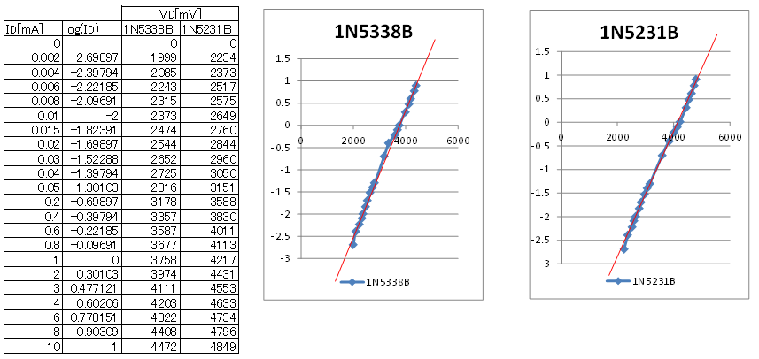 ツェナーダイオードの逆方向電圧と電流との関係は指数関数に近いことが判りました。