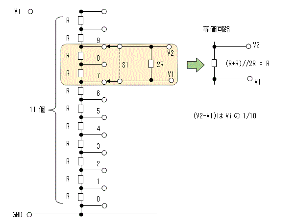 結局、入力電圧Viは10個の等しい抵抗Rで10分割され、