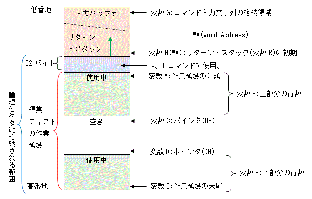 | 10000 | EDIT | --- | X:入力文字数 Y:コマンドの次のアドレス | エディターのメイン・ループ。プロンプト>を表示した後に コマンドを入力して、各コマンド処理にに分岐します。 |