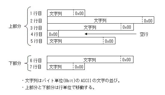 | 1600 | DISP1 | Y: 文字列のアドレス-1 | --- | 配列に格納された文字列を画面に出力します。 文字列の位置は変数Y+1から 区切り文字0x00までです。変数Yが BOTM(変数B)に達しているときは何も表示しません。 | |