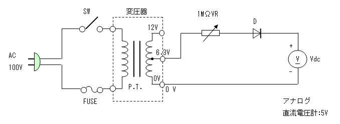 (2)半波整流回路と直流電圧計による交流電圧測定