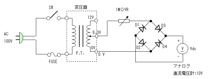ブリッジ(全波整流回路)と直流電圧計による交流電圧測定