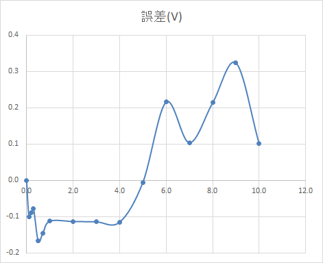 測定値が1.0V〜4.0Vでは誤差は最大0.2V、測定値が4.0V以上では誤差は最大0.1Vとなりました。