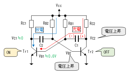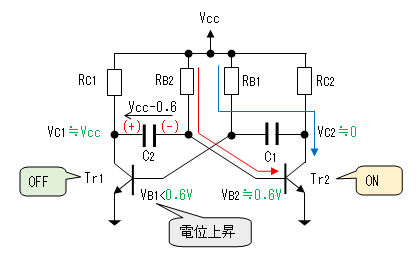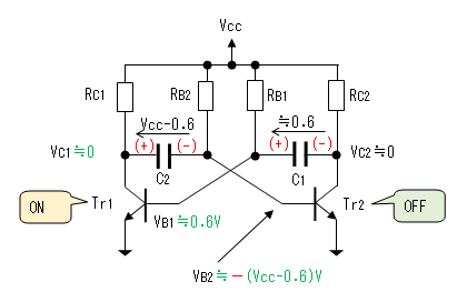 コンデンサ(C2)の両端の電圧は(Vcc - 0.6)[V]なので、Tr2のベース電圧