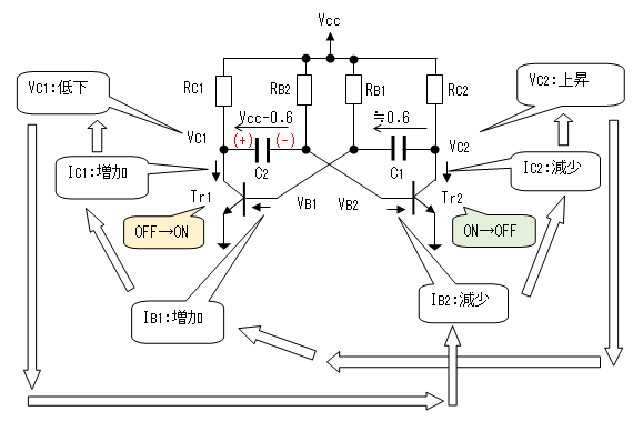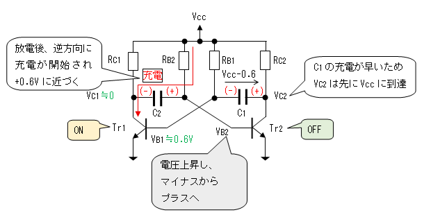 と、正帰還がかかり短時間にTr1とTr2のON/OFFが入れ替わります。