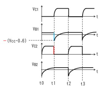 発振波形は上図のようになりますが、コレクタ電位VC1、VC2の立ち上がりは
