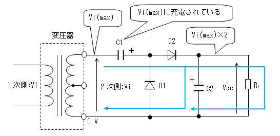 | ダイオード:D1は遮断 状態(OFF)です。 ダイオード:D2は 導通してコンデンサー:C2 をVi(max)まで充電します。 C1、C2がそれぞれVi(max) まで充電され、一方負荷(RL) は直列に接続されたC1、C2と 接続されいるため、Vdcは Vi(max)の2倍となります。 |