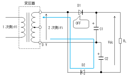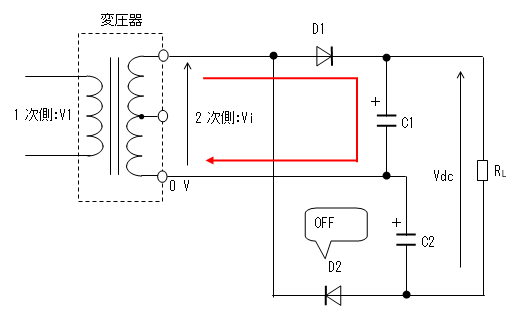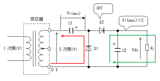 | ダイオード:D1は 遮断状態(OFF)になります。 ダイオード:D2は導通して、 コンデンサー:C2と負荷に 電流が流れます。 この時、ViとC1が直列接続に なるため、VdcはVi(max)の 2倍となります。 |