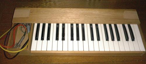 かつて秋葉原のラジオ会館の地下1Fの店で ケースのないキーボードを部品として売っていました。 10k+@\くらいだったと思います。 ケースはホームセンタから木材を購入して自作しました。 左端のケーブルは、本当はアルミ・パネルを木ねじで取り付け、 パネルに取り付けた標準ジャック経由で配線する計画だったものが、 結局バラック配線のままとなっています。(2005/12/11)