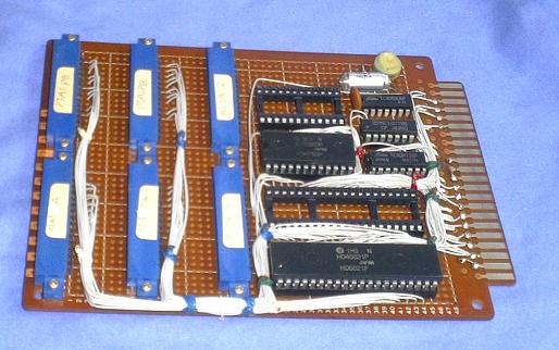 6800のファミリである専用LSIを使用したI/Oボードです。 汎用パラレル入出力を2ポート持つLSI「6820」と、 調歩同期シリアル入出力LSIである「6850」を 各2個搭載出来ますが、写真に示すように各1個しか実装していません。