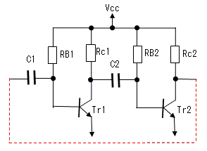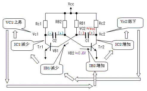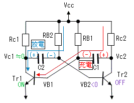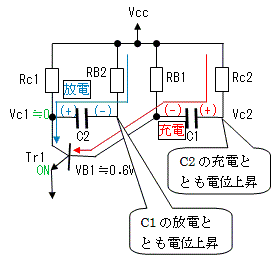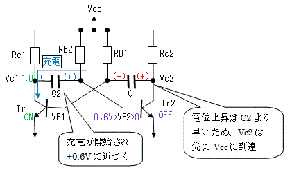 コレクタ電位Vc1の上昇は、C2を経由してTr2のベース電位の上昇させるため