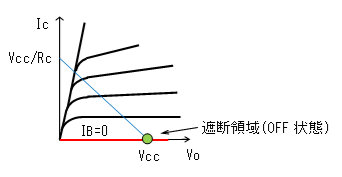 やがて、IB≒0mAになると、Ic≒0mAになるためVo≒Vccとなります。