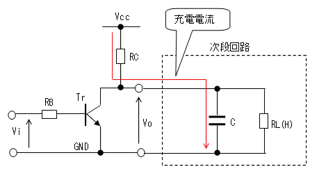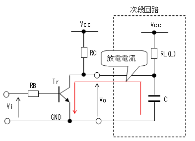 トランジスタがOFFからONに遷移するときはコンデンサーの電荷がトランジスタを