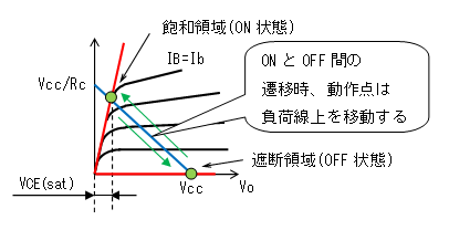 トランジスタをスイッチとして使用する場合、静特性上では上記のように遮断領域と飽和領域を