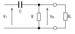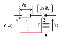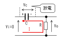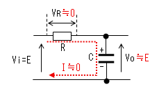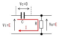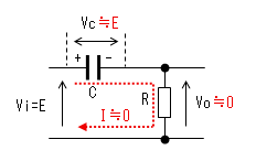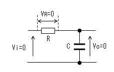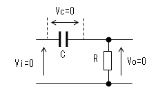 コンデンサーの電荷が0なので 両端の電圧(Vc)も0です。 出力(Vo)は抵抗(R)により 直流的にも0[V]です。 |