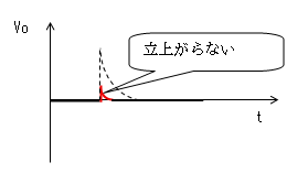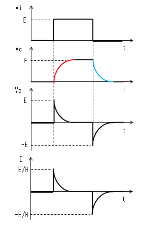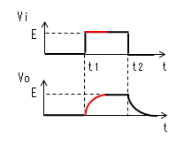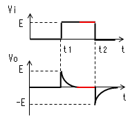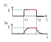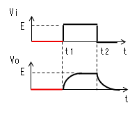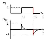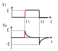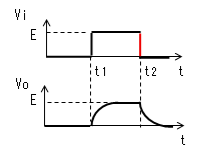 時定数がパルス幅より十分 小さいと、時刻がt2になる前に コンデンサーがVc≒Eまで充電 されます。よってVo=E-Vc≒0、 I=Vo/R≒0になります。 |