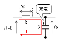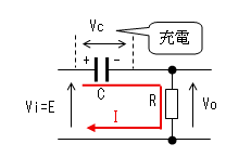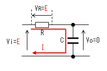 時刻t1で入力(Vi)がVi=Eに 立ち上がります。 コンデンサー(C)はすぐに充電 しないので、この瞬間のVcは 0のままです。よって出力電圧 (Vo)もEに立上がります。 コンデンサーから抵抗に電流が 流れ始めますが、この瞬間の 電流IはI=E/Rです。 |