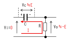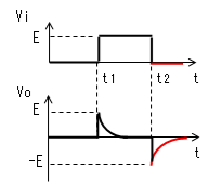 時刻t2で入力(Vi)がVi=0に 立ち下がります。 コンデンサー(C)はすぐに放電 しないので、この瞬間のVcは Eのままです。よって出力電圧 (Vo)は−Eに立下がります。 コンデンサーから抵抗に電流が 流れ始めますが、この瞬間の 電流Iは|I|≒E/Rです。 |