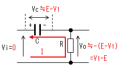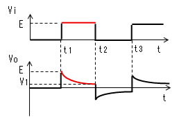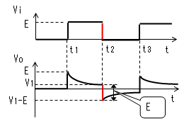 時刻t2で入力(Vi)がVi=0に 立ち下がります。 コンデンサー(C)はすぐに放電 しないので、この瞬間のVcは (E-V1)のままです。よって出力電圧 (Vo)は(V1−E)に立下がります。 |