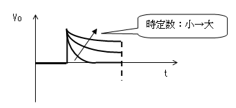 電流Iによりコンデンサーが充電 されるのでVcは0から次第に大きく なります。Vcが大きくなるとVoが 次第に小さくなるので、電流Iも 次第に小さくなります。 そのカーブは指数関数です。 |
