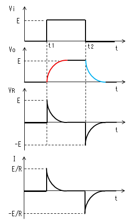 時刻t1で入力(Vi)がVi=Eに 立ち上がります。 コンデンサー(C)はすぐに充電 しないので、この瞬間の出力(Vo) は0のままです。抵抗の両端にEの 電圧がかかります。 抵抗からコンデンサーに電流が 流れ始めますが、この瞬間の 電流IはI=E/Rです。 |