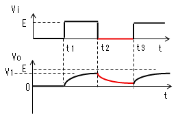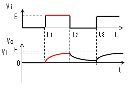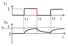 電流Iによりコンデンサーが充電 されるのでVcは0から次第に 大きくなりますが、t2になっても Eまで充電しきれず、VoはV1まで しか低下しません。 |