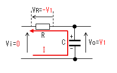 時刻t2で入力(Vi)がVi=0に 立ち下がります。 コンデンサー(C)はすぐに放電 しないので、この瞬間のVoは V1のままです。 |