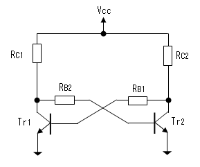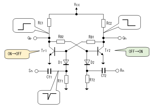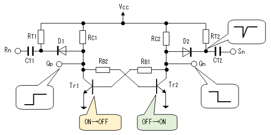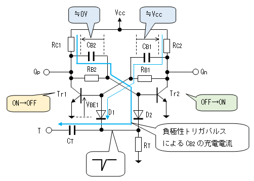 負極性 | トリガをベースに印加するので トランジスタの 増幅作用により トリガの電力が少なくて済む。 この裏返しとして、ノイズに やや敏感となる。 |